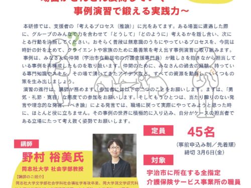 宇治市内介護保険事業者 研修ご担当者各位 いつもお世話になっております。 本日は今年度の最終回となり […]