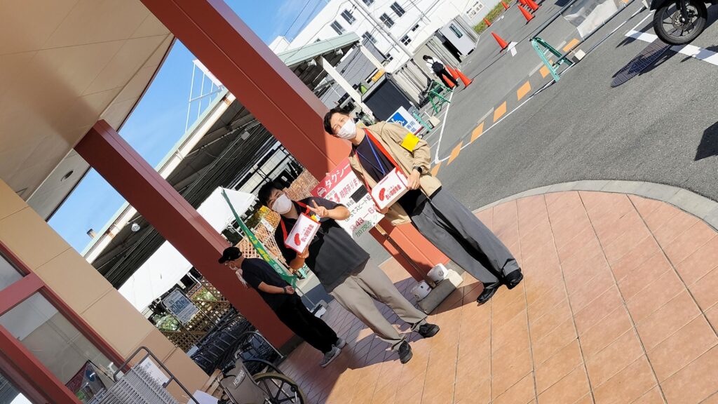 若手職員5名を中心に赤い羽根共同募金活動に参加しました。コーナン宇治駅前で大きな声で「赤い羽根共同募金です!ご協力ください!」と呼び掛け、多くの市民の皆さんにご賛同いただき、ご協力をいただきました。