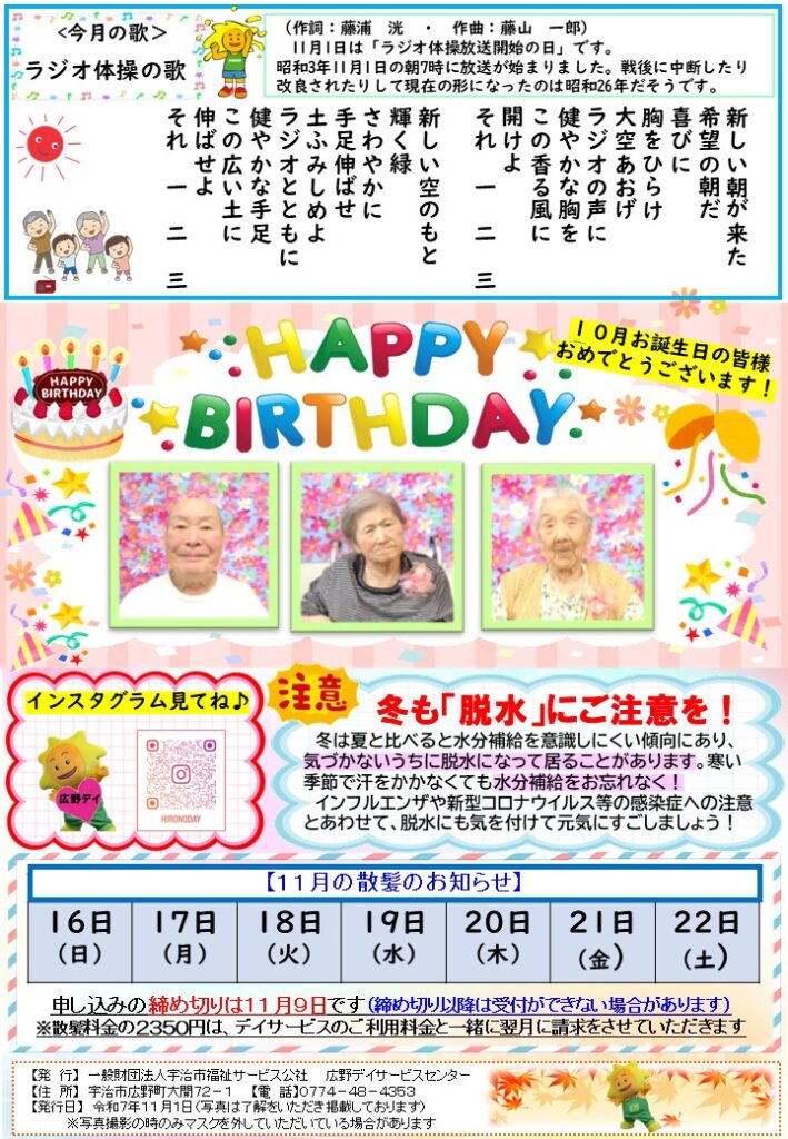 こんにちは!広野デイサービスです♪広野デイサービスだより「にこにこひろの162号」をお届けいたします!ぜひご覧ください♪「にこにこひろの」は広野デイサービスのインスタグラムでもごらんいただけますよ~!