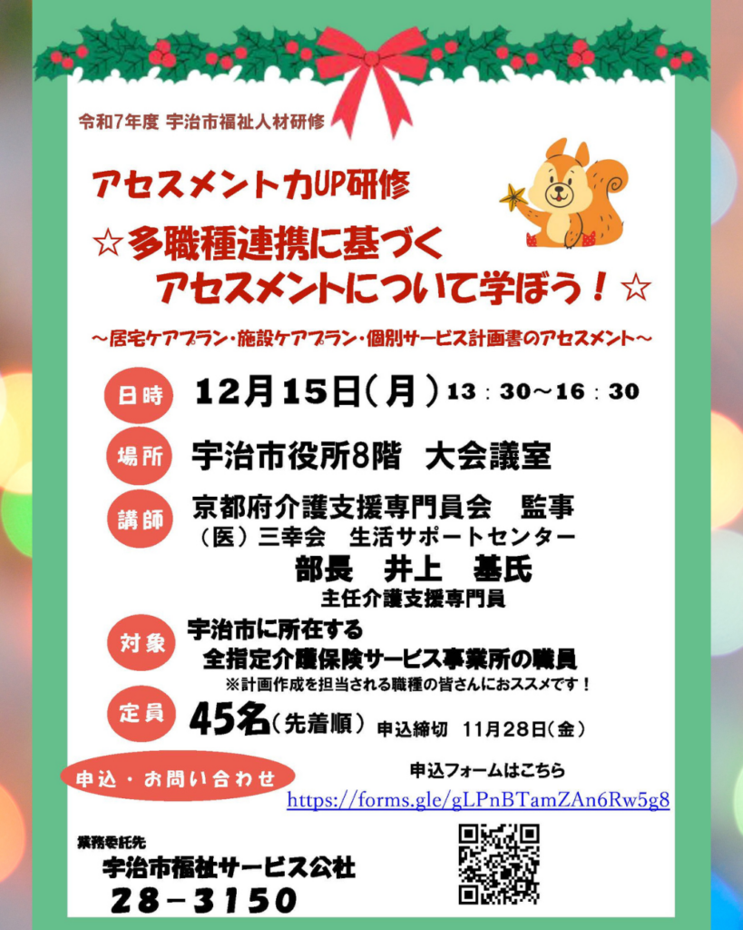 12月15日(月)に開催の第7回宇治市福祉人材研修のご案内です。