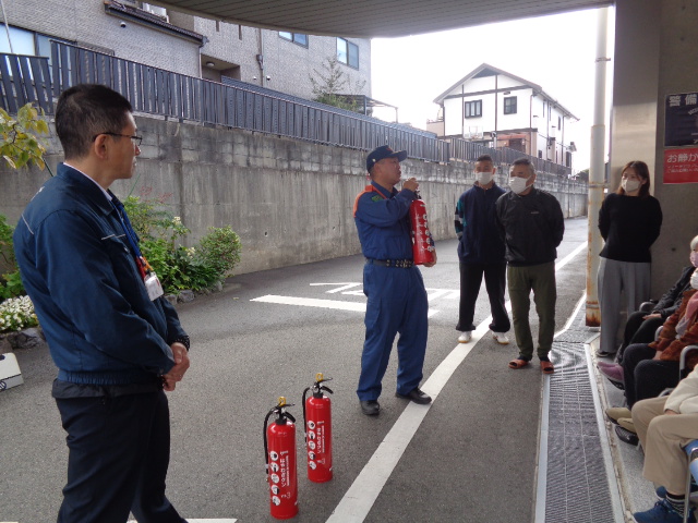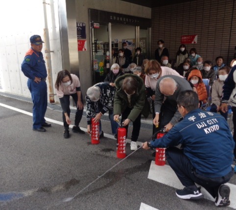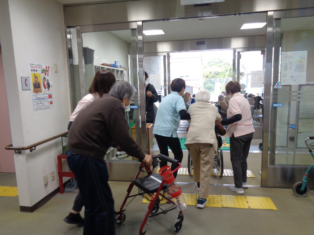 本日はデイサービス利用者18名、ホット大開のメンバー10名、職員17名 計45名で非常災害訓練を実施しました。震度7相当の地震を想定し、地震の揺れによる二次被害による火災が発生し、避難訓練、消火器訓練を実施しました。中消防署員からの批評と火災予防に諸注意についてお話をいただきました。