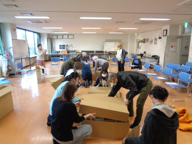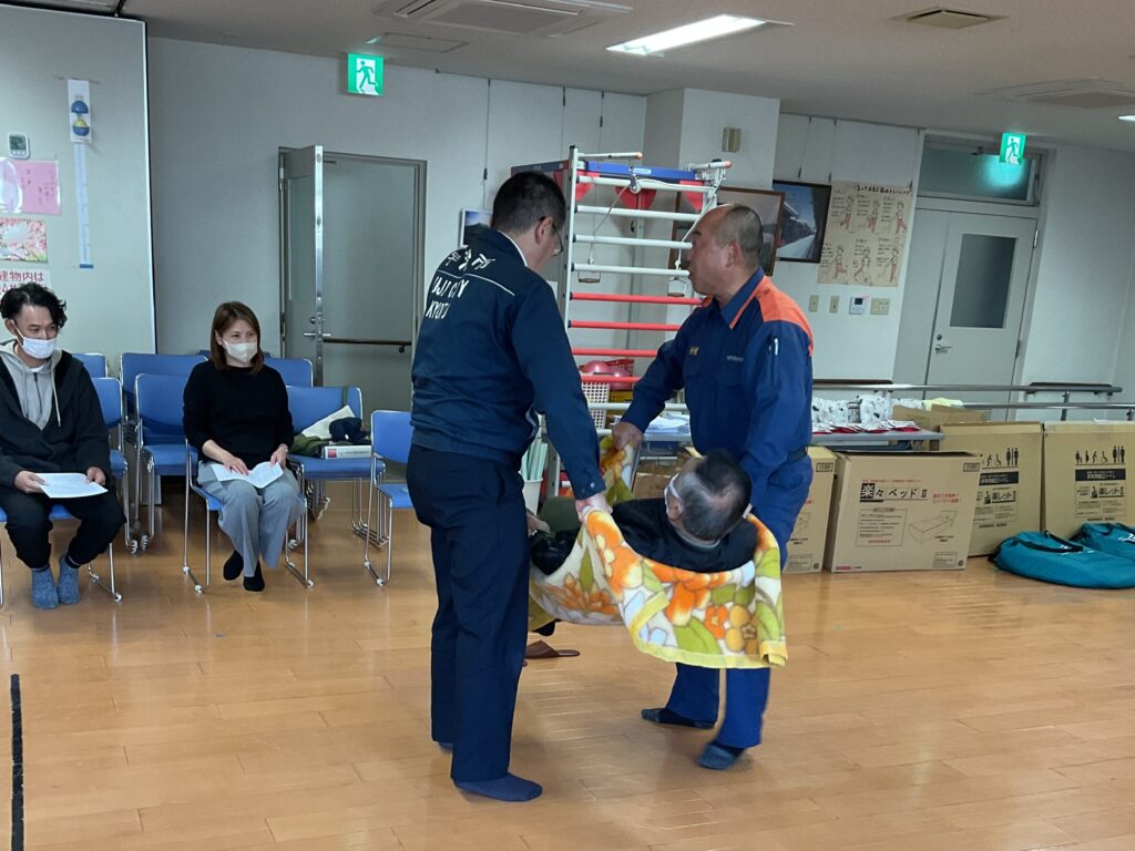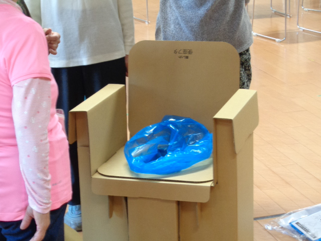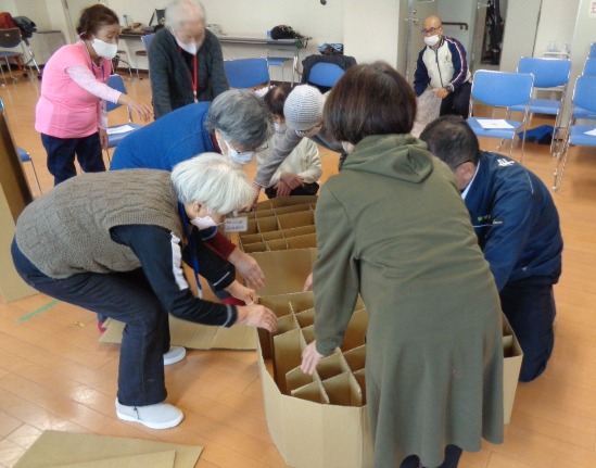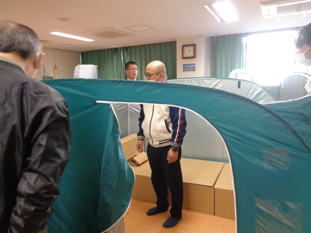 また、宇治市危機管理課より避難所体験にあたり、段ボールでの簡易ベッドやトイレの作り方を教えていただきました。改めて、災害時における備えを日頃からの訓練することの大切さを体感しました。デイサービス利用者の皆様にもベッドやトイレに触れていただき、「しっかりしたものやな」と感心されていました。