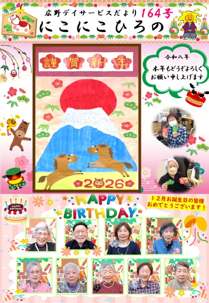 あけましておめでとうございます!広野デイサービスです♪令和8年、本年もどうぞよろしくお願い申し上げます年始のご挨拶に、広野デイサービスだより「にこにこひろの164号」をお届けいたします。本年も広野デイサービスの楽しい様子をお届けしていきますので、インスタグラムも合わせてお付き合いのほど、なにとぞよろしくお願い申し上げます♪
