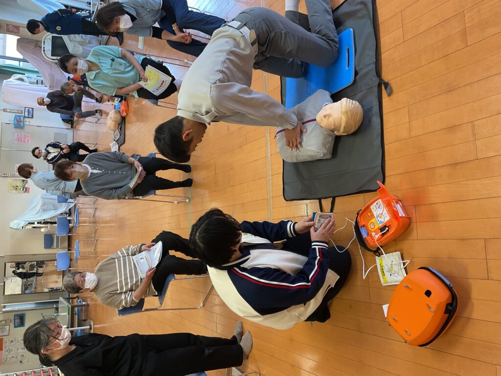 年1回職員研修として救命講習会を開催しました。消防署2名の職員さんによりAEDの使用方法と胸骨圧迫を繰り替えし、12名の職員が2グループで順番に演習を実施しました。