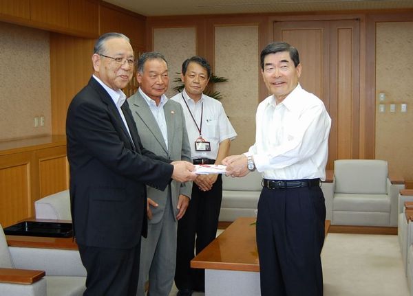 ![]() 岡本理事長、伊藤副理事長、五艘専務理事が 山本市長にお渡しました。 |